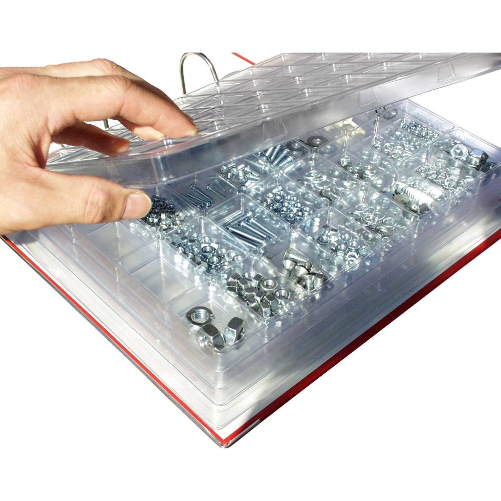 Robosztus alkatrésztároló különféle elemek (pl. SMD, ellenállások, kondenzátorok, biztosítékok, IC-k stb.) tárolására.DIN A 4 gyűrűs tartóba rendezhető, 2 vagy 4-es mechanikával, az áttekinthető rendszer érdekében. A 32 mélyhúzott PVC rekesz, fixen lezárható, ez megakadályozza az egyesrekeszbeli csoportok összekeveredését.
