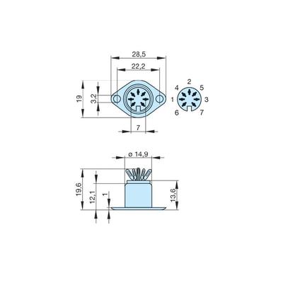 Műszaki adatok: Anyag: PA66 · Csatlakozó: Forrasztható · Csatlakozó típus: DIN kerek csatlakozóhüvely · Dugócsatlakozó kivitel: Peremes hüvely, egyenes érintkezők · Gyártói szám: MAB 7 S · Kivitel: Típusszám: 7 · Névleges feszültség: 34 V/DC · Névleges áram: 4 A · Pólusszám: 7 · Szín: Ezüst · Tartalom: 1 db · Típus: 7 · Védelmi típus: IP30 · Érintkezőanyag: Ónozott