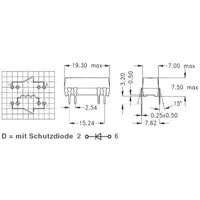 Műszaki adatok: Csatlakozó: Nyák · Ellenállás (tekercs): 2000 Ω · Ház típus (félvezető): DIP-8 · Hőmérséklet (max.): 70 °C · Hőmérséklet (min.): -20 °C · Kapcsolási feszültség (max.): 200 V/DC · Kapcsolási teljesítmény (max.): 10 W · Max. kapcsolási áram: 0.5 A · Méret, hossz: 19.3 mm · Méret, magasság: 7.5 mm · Méret, szélesség: 7 mm · Névleges feszültség: 24 V/DC · Relé jellemzők: Védődióda nélkül · Relé típus: Reed relé · Típus: DIP24-2A72-21L · Érintkező típus: 2 záró · Érintkezőanyag: Irídium