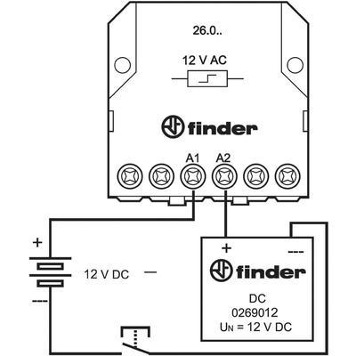 Adapter egy 12 V/AC-os tekercs vezérléséhez, 12V/DC-ről. A Finder gyártmányú 26-os sorozatú lökőáram-kapcsolókhoz illeszthető.
