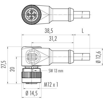 Műszaki adatok: Kivitel: Könyök-doboz M12 x 1 menetes reteszeléssel/LED · Pólusszám: 3 · Tartalom: 1 db · Vezetékhossz: 5 m