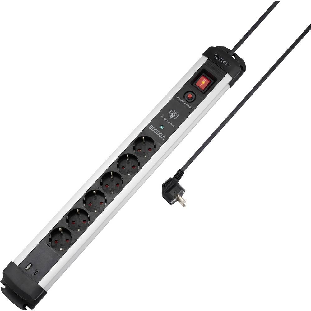 Sygonix SY-6805674 Túlfeszültség ellen védő elosztó 6 részes Fekete, ezüst Védőérintkezős 1 db
