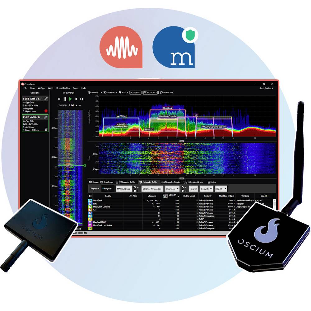 Az Oscium Spectrum Bundle a kompakt és tökéletes eszköz a spektrumanalízis elsajátításához. Valós idejű betekintést nyerhet 2,4, 5 és 6 GHz-es (Wi-Fi 6E) hálózataiba, pontosan meghatározhatja az interferencia forrásait, figyelemmel kísérheti a csatorna telítettségét, és még a legnehezebben megfogható időszakos problémákat is észlelheti. Professzionális elemző és jelentéskészítő eszközökkel mindent megtalál, amire szüksége van a hálózati teljesítmény optimalizálásához és a megbízható lefedettség biztosításához.