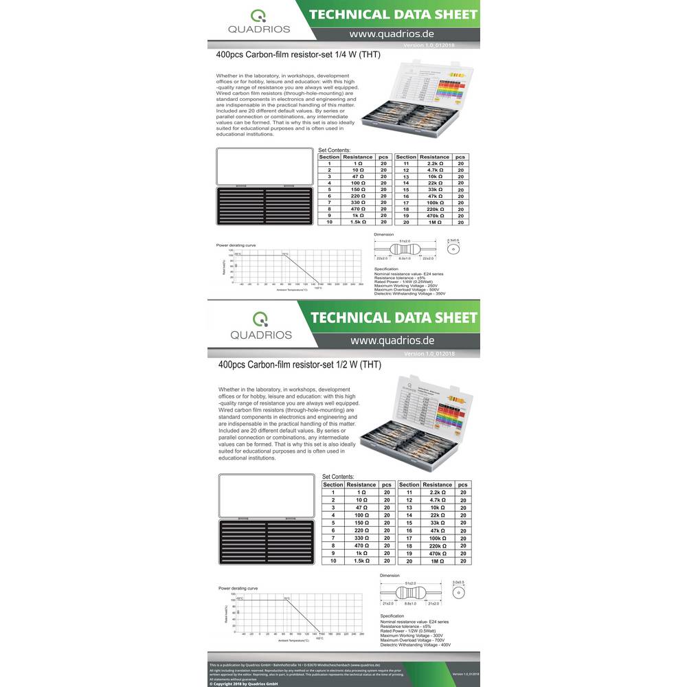 Akár a laboratóriumban, akár műhelyekben, fejlesztőirodákban vagy hobbi, szabadidő és oktatás céljából: Ön mindig jól felszerelt ezzel a kiváló minőségű ellenállással. A vezetékes szénfólia ellenállások (átmenő furatú rögzítés) az elektronika és a technológia alapelemei közé tartoznak, és nélkülözhetetlenek ennek az ügynek a gyakorlati kezelésében. 20 különböző standard értéket tartalmaz két teljesítményosztályban. Soros- és párhuzamos kapcsolásban ill. kombinációban bármilyen köztes érték képezhető. Ezért ez a kombináció ideális oktatási célokra is, és gyakran használják oktatási intézményekben. Az alapvető műszaki adatok, mint ellenállásérték, színkód stb., egy pillantással leolvashatók a fedél belsejéről