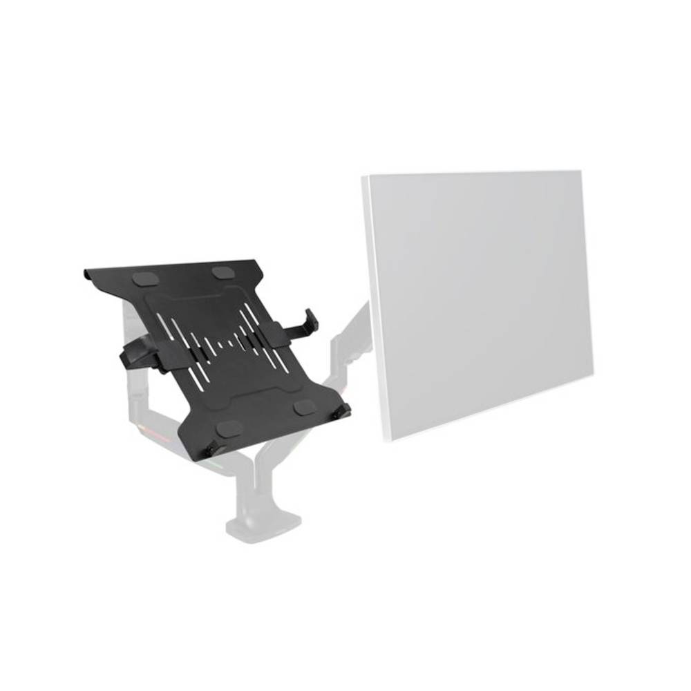 Az univerzális monitorkaros laptoptartó egy stabil és biztonságos eszköz, amely könnyedén rögzíthető bármely monitorkarhoz szabványos VESA® 75/100 lemezzel, és a laptopot az asztalról szemmagasságba emeli, így több munkaterületet szabadít fel. Támogatja a 16 és 4,5 kg súlyú laptopokat. Az állítható bilincsek és biztonsági rudak biztonságosan rögzítik a laptopot, és megakadályozzák annak elcsúszását. A nyitott kialakítás elősegíti a laptop légáramlását és hűtését.