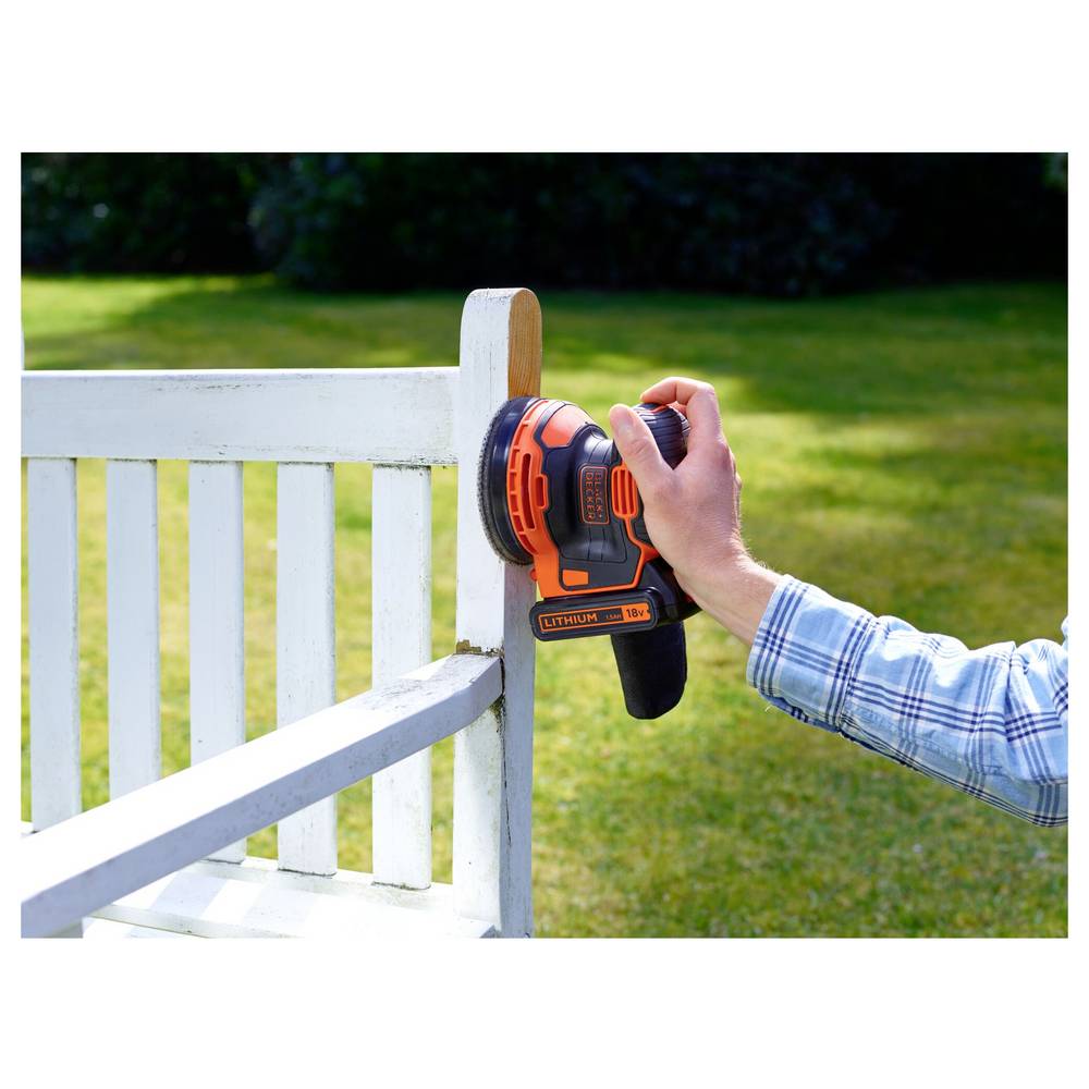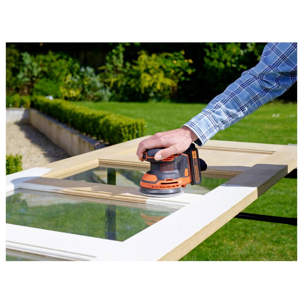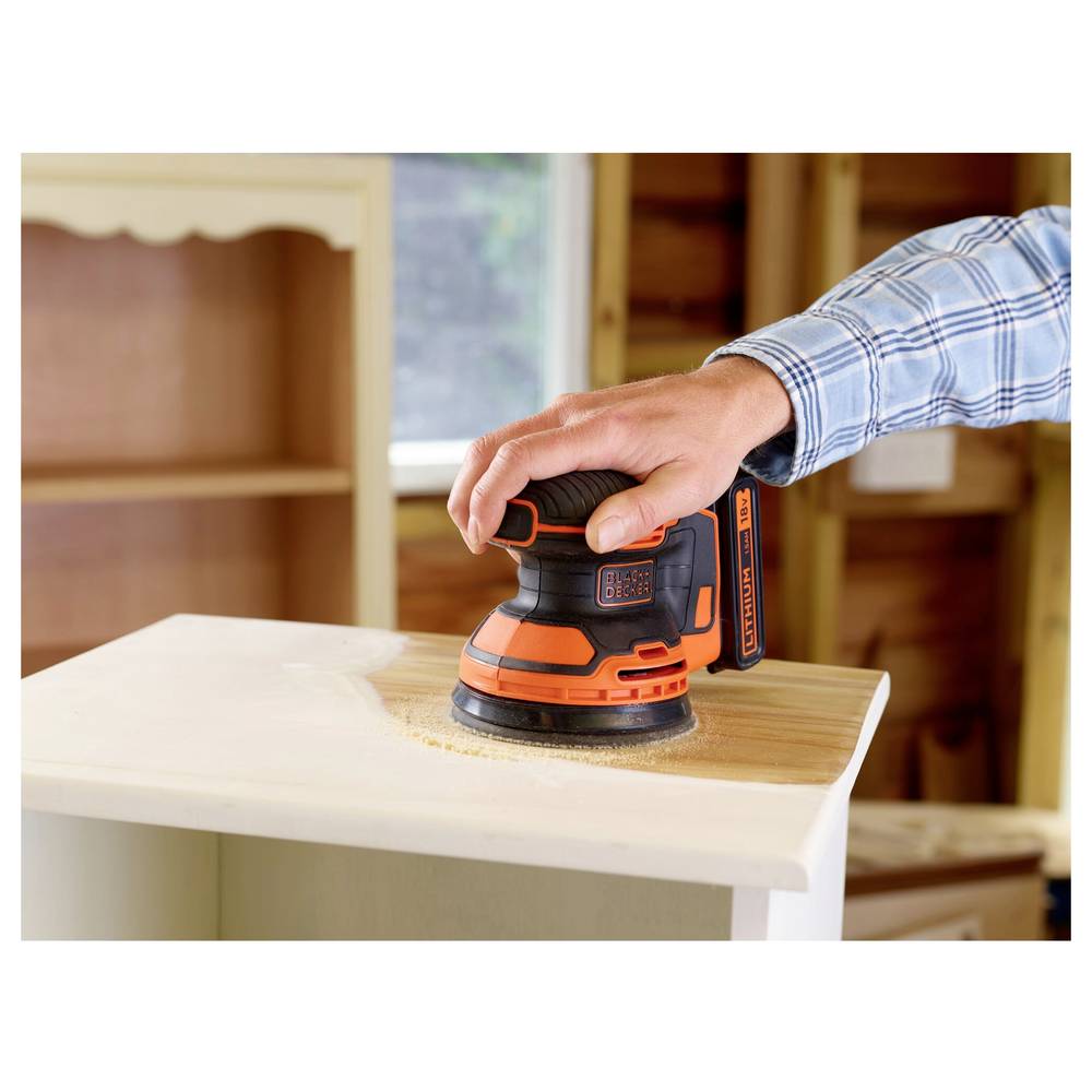 Nagy teljesítményű Black+Decker lítium-ion akkumulátoros excentercsiszoló 24 000 percenkénti fordulatszámmal a nagy anyagleválasztási teljesítményért.