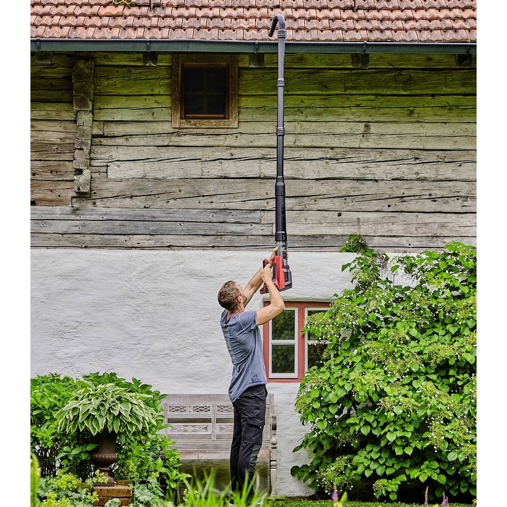 Az ereszcsatorna készlet lehetővé teszi az ereszcsatornák gyors és egyszerű tisztítását akkumulátoros lombfúvóval. Az ereszcsatorna készlet az Einhell GP-LB 18/200 Li E akkumulátoros lombfúvóval együtt használható. Az 5 részes készlet egy összekötő elemből, három egyenes és egy íves csőből áll. Az integrált csavarkötésekkel az ereszcsatorna-készlet szerszám nélkül felszerelhető. Az ereszcsatorna szett hossza egy, két vagy három egyenes hosszabbítócső beépítésével határozható meg - attól függően, hogy mekkora az elérendő ereszcsatorna.