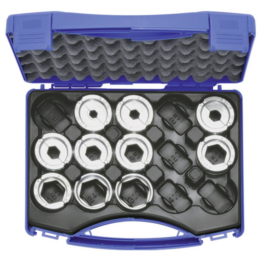 Alkalmas DIN - Al szabvány szerinti krimpelő kábelsarukhoz és összekötőkhöz, Al/Cu (alumínium oldal) krimpelő kábelsarukhoz és összekötőkhöz. Présbetét készlet műanyag dobozban, 11 darabos.
